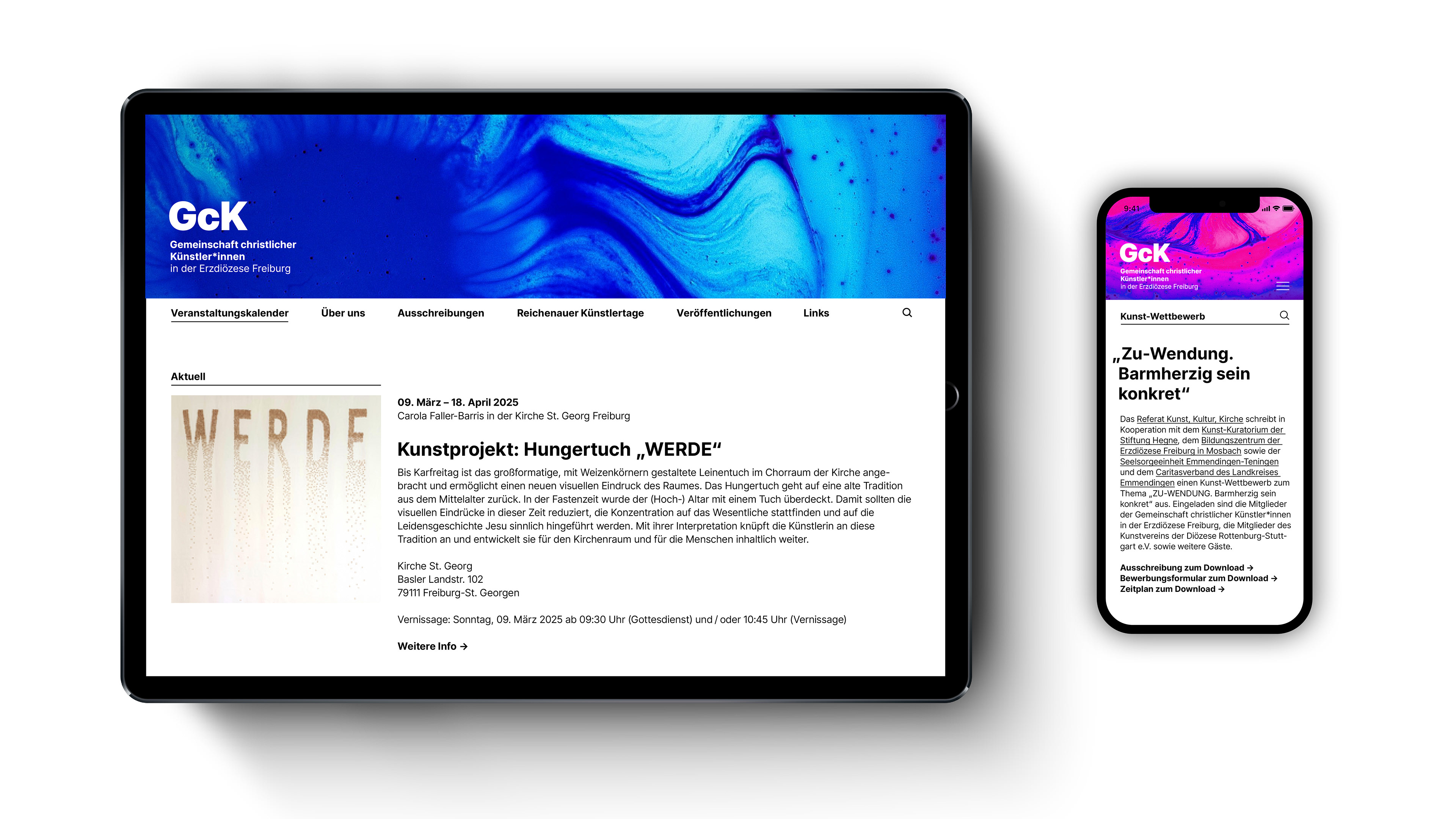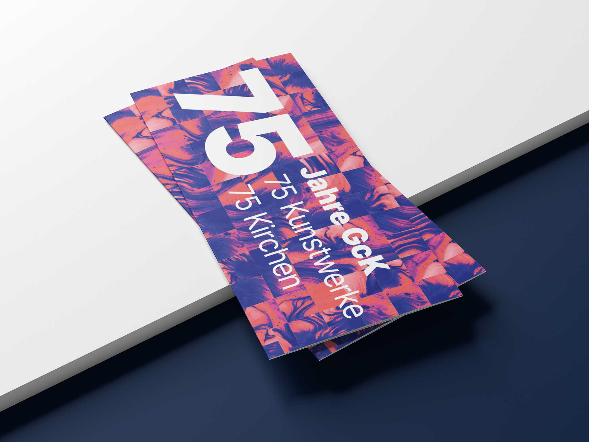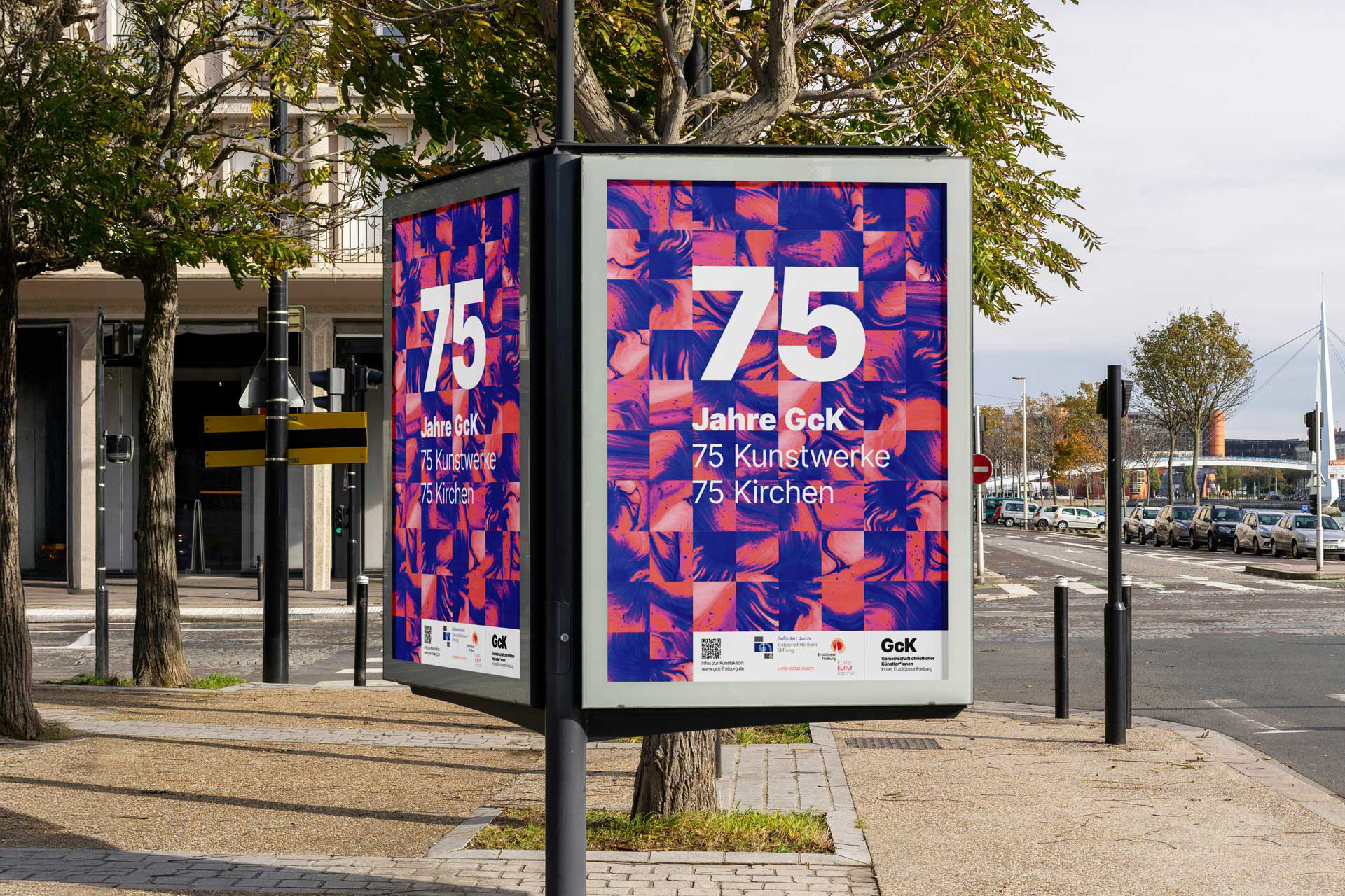 Die Gemeinschaft christlicher Künstler*innen in der Erzdiözese Freiburg wurde 1950 gegründet und ist der Zusammenschluss von Schaffenden der bildenden, angewandten und darstellenden Kunst, sowie der Literatur und Musik. Ihr Anliegen ist die Pflege, der Erhalt und die Erweiterung der Kunst im religiösen Kontext. Für das 75-jährige Jubiläum durften wir im Austausch mit dem Vorstand einen neuen Auftritt entwickeln und die Ankündigung des Bestehens gestalten: 75 individuell gestaltete Kunstaktionen, welche die Vielfalt christlich inspirierter Kunst an unterschiedlichsten Orten zeigen, sichtbar machen.